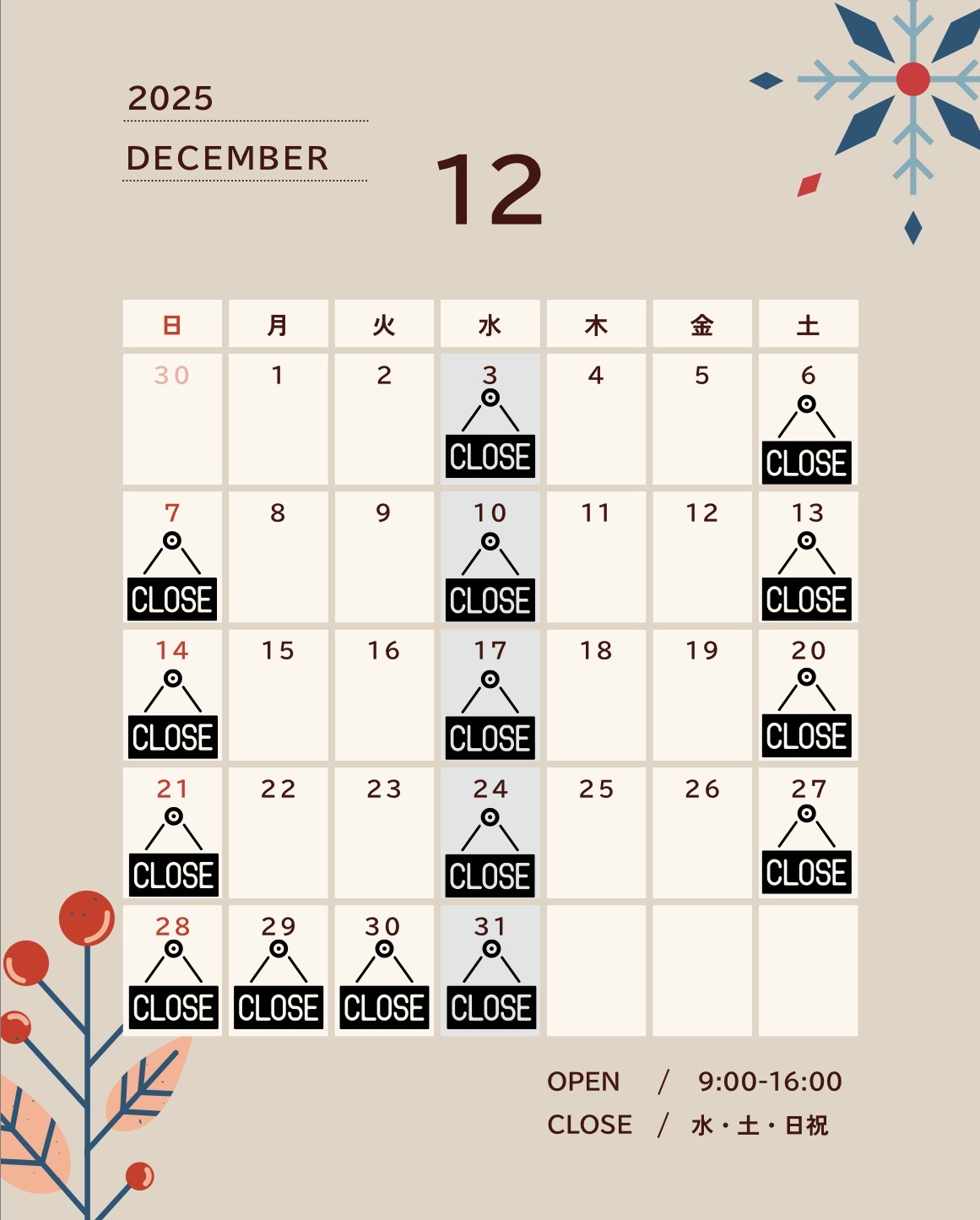 12月の営業カレンダー